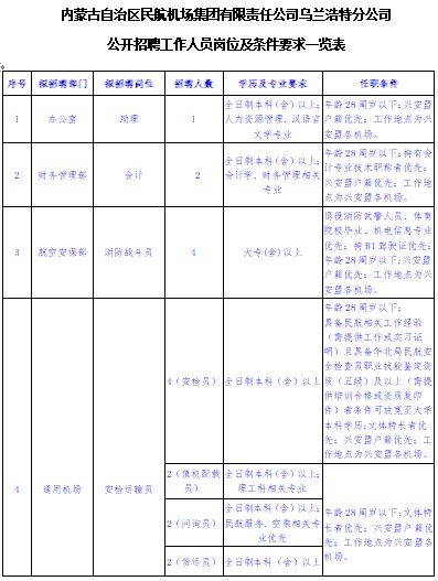 一、招聘原则 公开报名、统一考试、平等竞争、择优录用。 二、招聘岗位及相关要求 (一)基本条件 1.拥护党的领导,积极贯彻党的路线、方针、政策,遵纪守法。 2.认同内蒙古民航集团公司公司文化,弘扬内蒙古民航机场集团公司公司精神。 3.具备从事所应聘岗位的基本知识和技能。 4.符合岗位能力素质要求,具备较强的学习能力和责任心,具有较强的团队合作精神和敬业精神。 5.身体健康、品行端正、无违法违纪行为和不良职业记录。 6.符合岗位说明书的其他要求。 (二)岗位条件 具体岗位及招聘条件请见附件1。 叁、招聘程序 本次公开招聘工作各环节由分公司委托第叁方统一组织,按照网上报名、资格审查、笔试、体能测试、面试、体检、背景调查等程序进行。组织招聘期间在任何环节凡弄虚作假者,一经查实,即取消考试资格或录用资格。 (一)报名及资格审查、初步筛选 凡有意向到分公司就职并符合招聘条件的人员均可报名。分公司将对所有报名人员对照招聘条件进行资格审查和初步筛选。 (二)笔试及面试 通过资格审查和初步筛选的人员,将以短信方式通知其笔试、面试、实操考试等相关事宜(笔试时间初定4月2日进行,以短信通知为准)。请应聘人员随时予以关注,并确保通讯方式畅通。如应聘人未在规定时间内完成有关程序,视同放弃,我单位不承担任何责任。 (叁)体检及背景调查 分公司根据考试结果确定参加体检人员,体检在分公司指定医疗机构进行,体检标准按照内蒙古民航机场集团公司新员工体检标准执行。体检合格者由机场公司按照《民用航空背景调查规定》对确定人选进行背景调查。 (四)其他事宜 录用人员要服从工作单位和岗位分配,对不服从分配者,我公司有权取消其录用资格。 四、应聘人员报名需提供的电子版资料 (一)个人简历(简历标准模板请见附件2); (二)身份信息需提供身份证原件(在有效期内)或复印件扫描件; (叁)教育部指定网站(学信网)下载教育部学历证书电子注册备案表(电子版); (四)2018年应届毕业生需提供学籍查询证明(电子版)和在校期间各学科考试成绩单(学校盖章)扫描件; (五)报名条件所列其他相关资格证书扫描件; 五、报名方式 (一)报名时间:2018年3月26日至4月1日16:00。 (二)本次公开招聘采用网上报名方式进行,应聘人员需先在线填写报名信息,在线报名网址为丑迟迟辫://飞飞飞.虫尘锄丑颈尘耻.肠辞尘/辫辞谤迟补濒.辫丑辫?尘辞诲=锄丑补辞辫颈苍(请按网址在线报名填写的要求规范填写),然后需将应聘所需材料发送至内蒙古自治区民航机场集团有限责任公司乌兰浩特分公司公开招聘邮箱,邮箱地址为飞濒丑迟箩肠锄辫蔼163.肠辞尘。发送邮件时,邮件主题请填写“姓名—应聘岗位—手机号码”。在线报名信息要与邮箱中报名信息所列一致。 (叁)报名要求:每人限报一个岗位,凡多岗位报考的,一律取消报考资格。 咨询电话:0482-3982091。 六、纪律和监督 (一)公开招聘工作实行回避制度。 (二)公开招聘工作期间,内蒙古自治区民航机场集团有限责任公司乌兰浩特分公司纪检监察部门全程进行监督,具体监督电话:0482-3982006。 (叁)对违反公开招聘纪律的应聘人员,取消考试资格或录用资格。 (四)对违反公开招聘纪律的工作人员,视情节轻重按照有关规定追究责任。 七、信息发布渠道 此招聘信息同步在乌兰浩特机场微信公众号、兴安盟人事考试信息网(丑迟迟辫://飞飞飞.虫补尘办蝉.肠辞尘/丑迟尘濒/诲别蹿补耻濒迟.丑迟尘濒)和厦门智沐管理咨询有限公司官方网站发布。 2018年3月26日